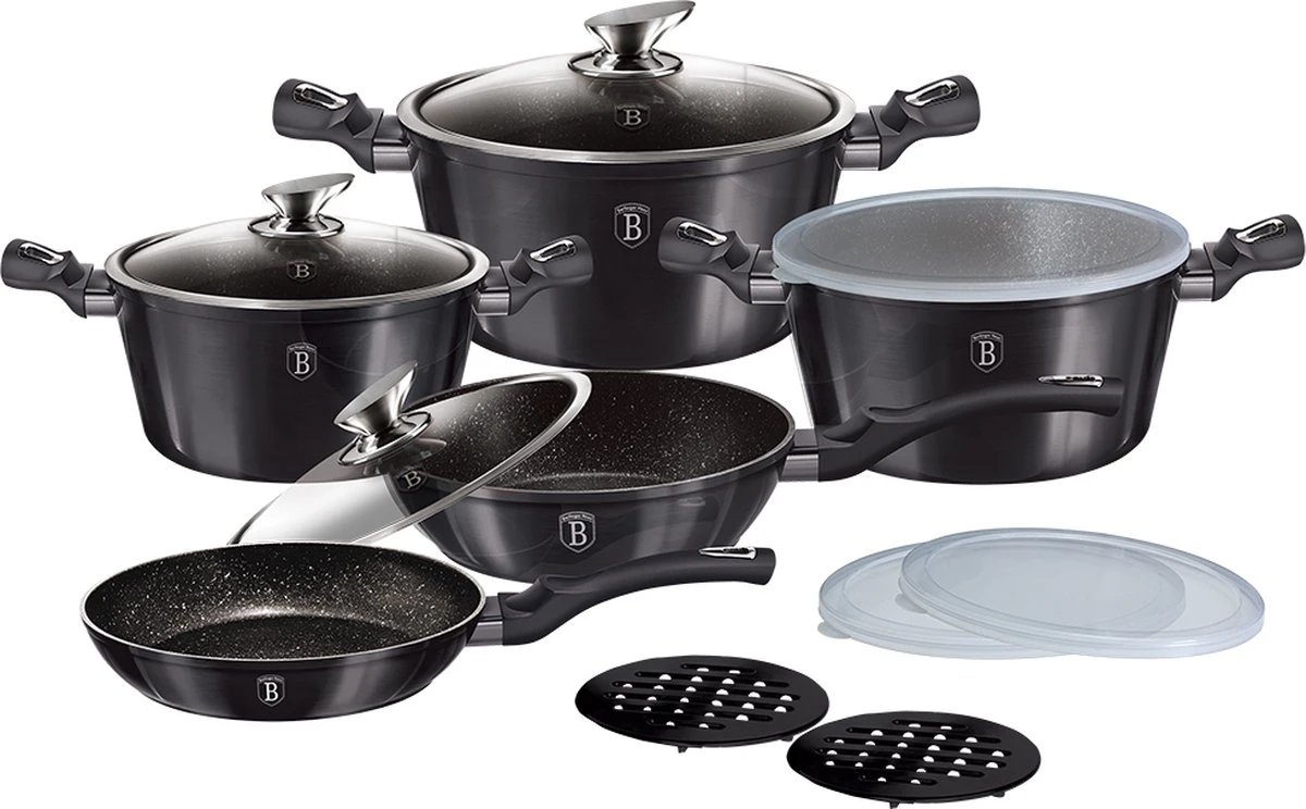 Deze Berlinger Haus Metallic Line pannenset bestaat uit dertien onderdelen, inclusief pannen en deksels. De pannen zijn voorzien van een 3-laags marmeren antiaanbaklaag, ergonomische soft-touch handgrepen, een Turbo inductiebasis en natuurlijk een elegant ontwerp. De T-glazen deksels hebben een RVS knop en 18/10 RVS ring en zijn gemaakt van kunststof.